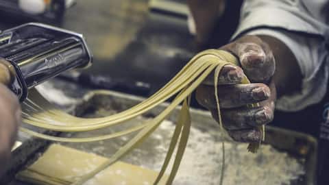 நல்ல பாஸ்தா செய்ய, மாவு சரியான பதத்தில் இருக்க வேண்டும். முதல்ல, ஒரு சுத்தமான இடத்துல மாவை குவிச்சு, நடுவுல குழி போட்டு, அதுல உப்பைப் போடுங்க. முதலில், ஒரு சுத்தமான இடத்தில் மாவை குவித்து, நடுவில் உப்பை சேர்த்து, கொஞ்சம் கொஞ்சமாக தண்ணீர் சேர்த்து, பரோட்டா மாவு பதத்திற்கு பிசையவும்.பத்து நிமிடங்கள் மாவை பிசையவும். அப்படி பிசையும்போது, அது மிருதுவாகவும், நீளக்கூடியதாவும் மாறும். இது பாஸ்தாவுக்கு ஒரு நல்ல வடிவத்தைக் கொடுக்கும்.